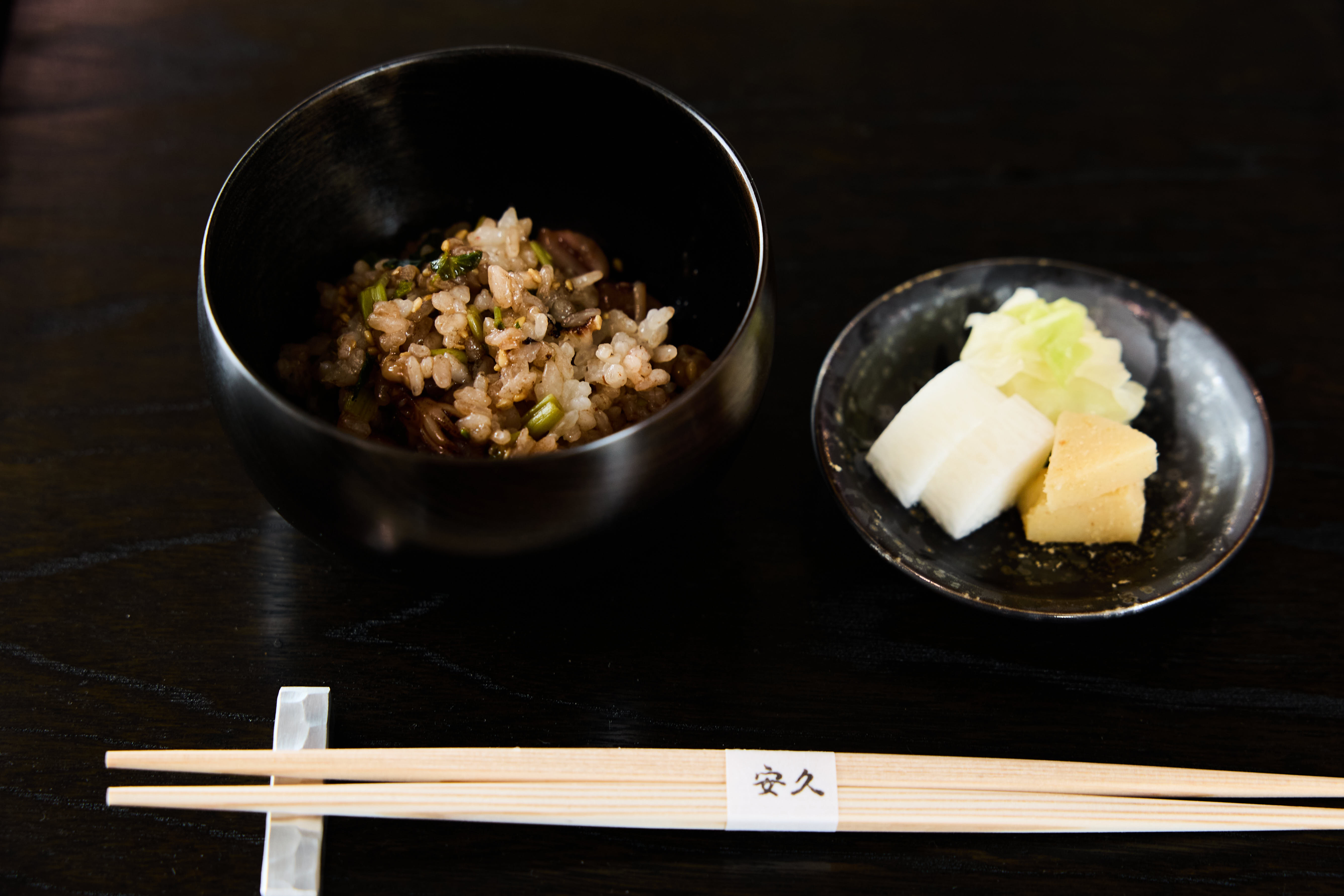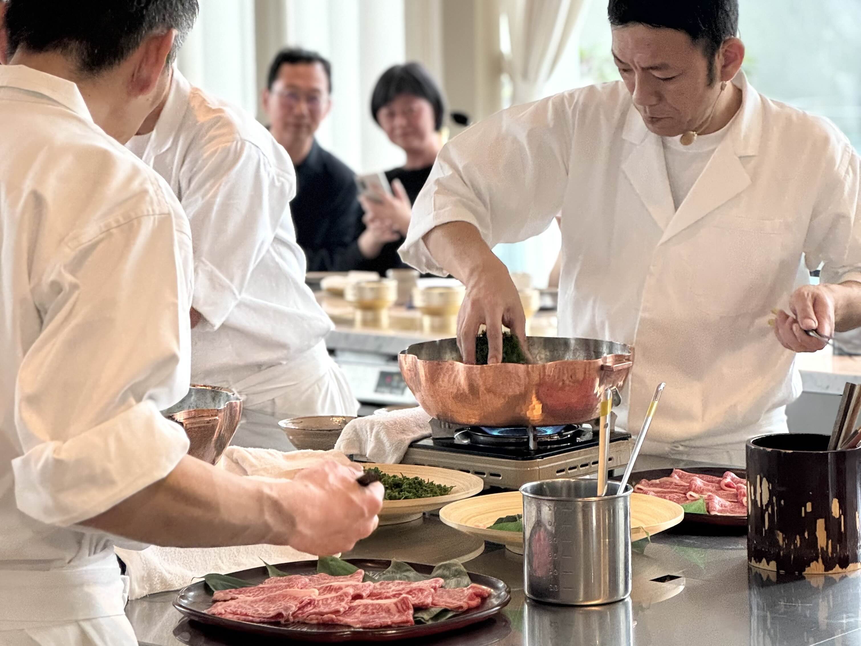 上田陽三對特定品牌醬油有著近乎偏執的堅持。為了這場全台灣只有三場、每場僅二十席的餐會,他與寶元紀團隊從日本扛了六桶醬油入台。餐具同樣講究,出發前,他特地走訪京都骨董街,重新採購符合安久風格的器皿,讓盤面的質地與料理的溫度能夠呼應。還有那些用於涮涮鍋的紅銅鍋具、煮炊飯的土鍋,也一併打包來台。六桶醬油、一批骨董碗盤、幾口紅銅鍋與土鍋,這些細節,構成了安久在台灣現場的物質骨幹,也說明了上田所謂「就算地點改變,初衷不會改變」背後,究竟藏著多少不妥協的日常堅持。