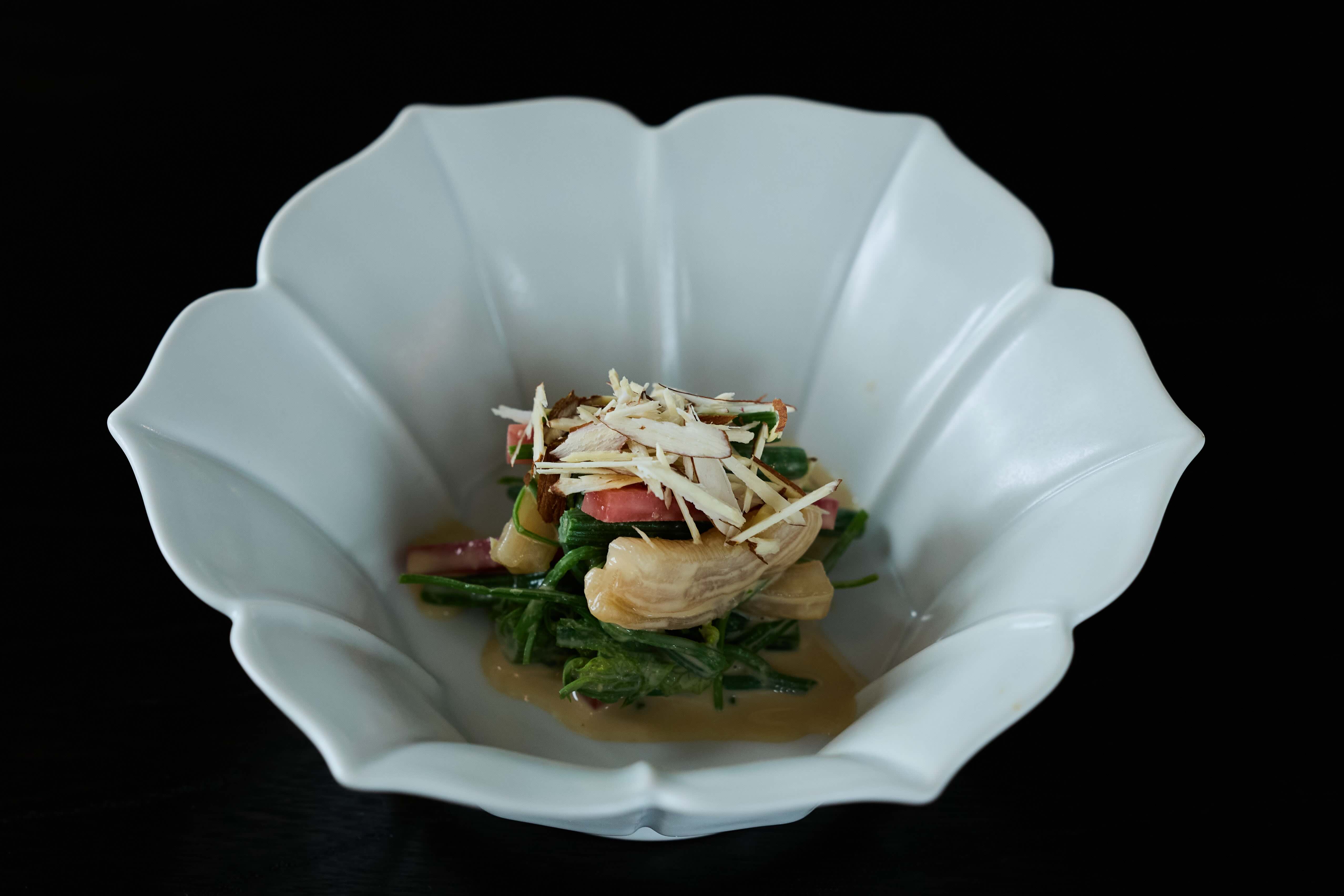 龍鬚菜在台灣是極為尋常的野菜,上田卻對它的獨特野味留下深刻印象,這次的「龍鬚菜・海螺胡麻和・金時紅蘿蔔甘醋漬」特別將它汆燙後浸泡高湯,搭配炙燒象拔蚌、胡麻醬與醋漬金時人參,撒上杏仁碎,讓台灣野菜的飽滿個性在日本料理框架裡舒展。