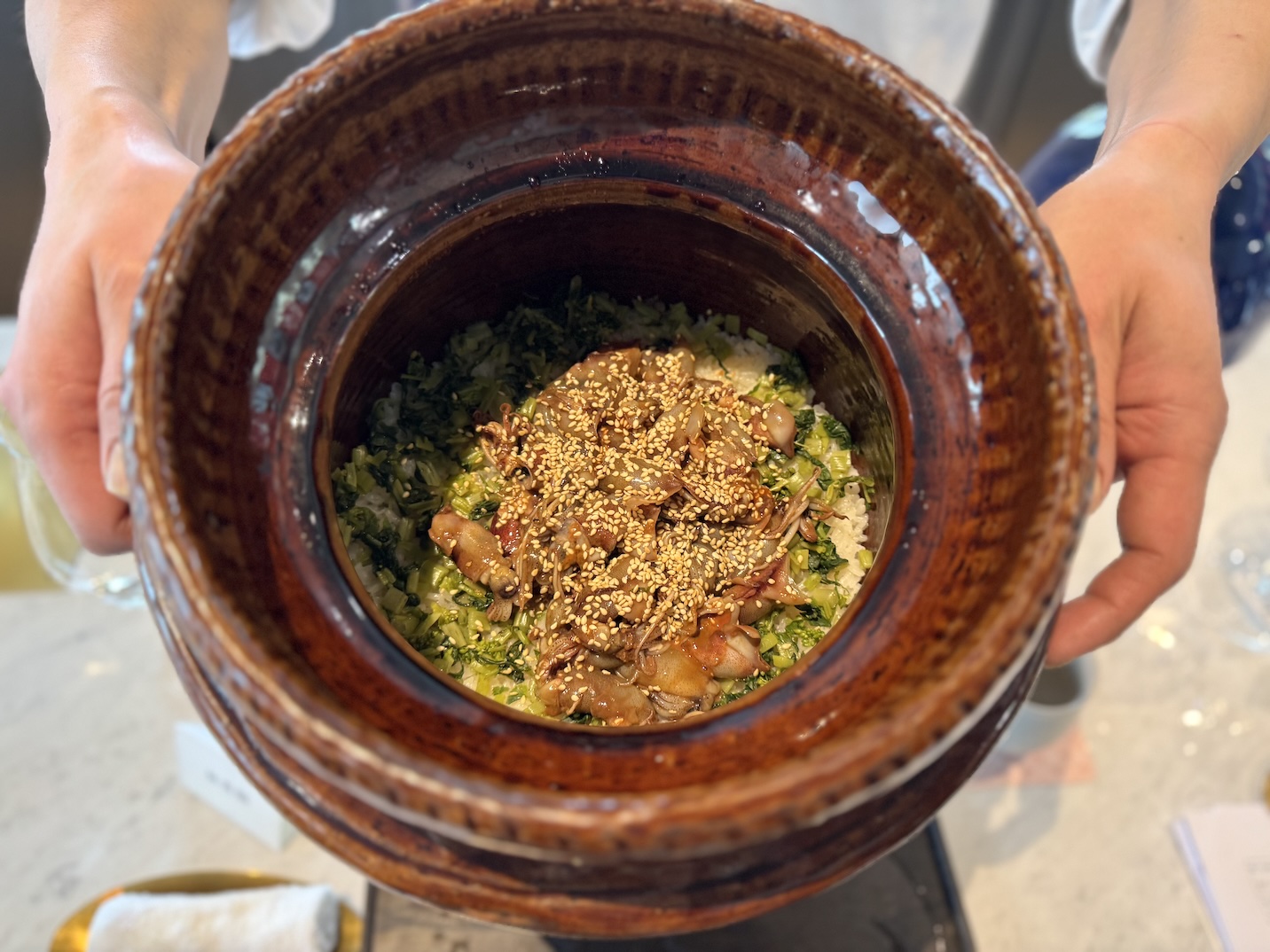 壓軸主食「螢烏賊花山葵炊飯・漬物」,用的是雲井窯的炊飯鍋具,炊煙升起時整桌的氣味驟然轉換。螢烏賊與花山葵同樣是3月下旬才進入最佳狀態的春季食材,兩者分別浸於高湯,充分吸納鮮味後,在米飯將成之際拌入。花山葵的清辛與螢烏賊的海味在蒸騰熱氣中交織而出,讓大家享受食材本身最好的那一面。