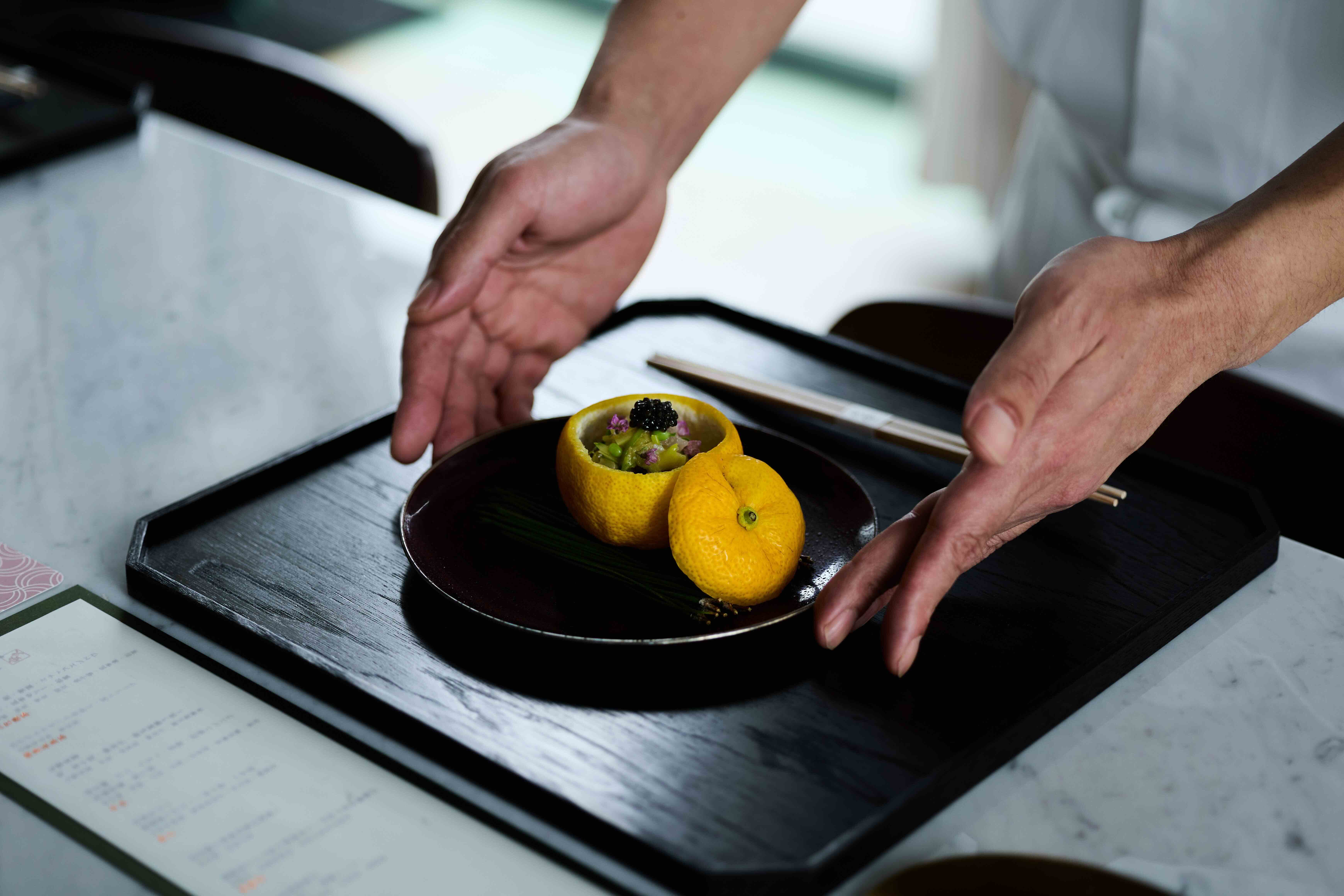 以柚子汁與橄欖油醃漬伊勢龍蝦與鮑魚,搭配魚子醬與昆布凍,讓「柚子釜」以明亮酸度開場。(圖片來源:寶元紀POUYUENJI)