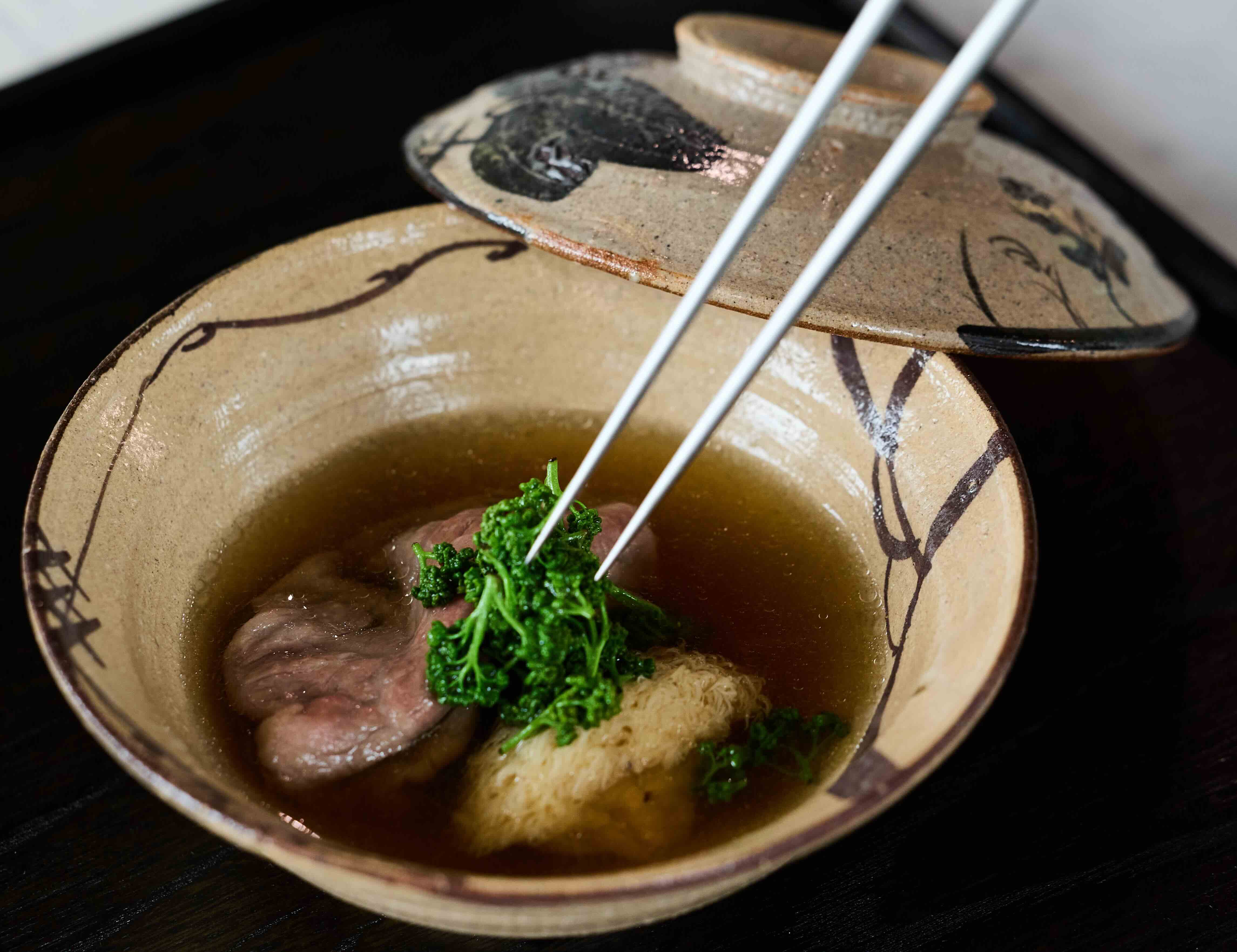 餐序後段,也是日本來台紅銅鍋正式登場的時刻。「花山椒牛肉涮涮鍋・猴頭菇」以紅銅鍋直接上桌,在客人眼前沸騰。主角之一花山椒,是日本春初才短暫現身的珍稀山菜,賞味期極短,每年春天開幕,旋即謝幕。上田說,在這個時節舉辦《旬刻》,才有機會向賓客介紹這個食材。花山椒的微麻與牛肉的鮮甜在滾湯裡交融,連湯底一併盛盤,讓賓客直接喝到那份季節辛味。另一個配角猴頭菇,則是上田來台走訪產地時的新發現,是他此前料理經驗中不曾接觸過的食材,此次特別收入菜單,成為這道鍋物與台灣風土之間一條細細的隱線。